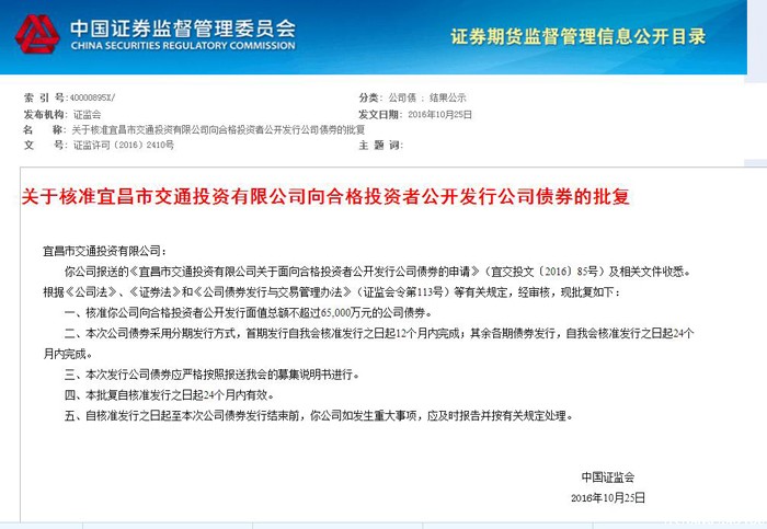 2016年10月25日,筆者從中國證券監(jiān)督管理委員會獲悉,根據中國證監(jiān)會證監(jiān)許可【2016】2410號《關于核準宜昌市交通投資有限公司向合格投資者公開發(fā)行公司債券的批復》文件,交投公...